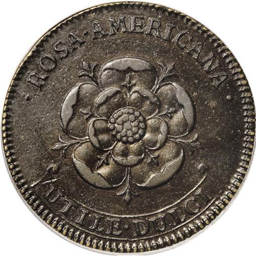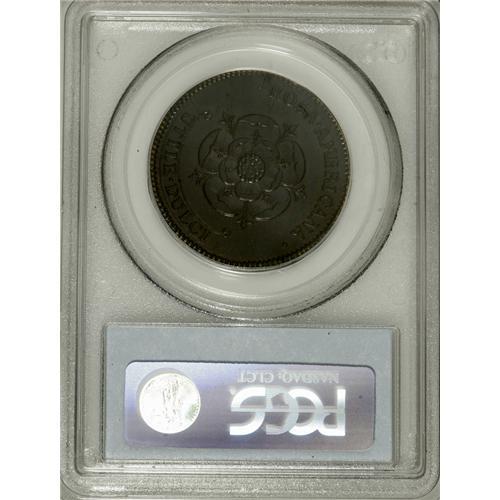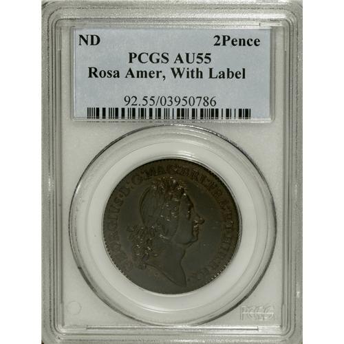 <B>Undated 2PENCE Rosa Americana Twopence, Label AU55 PCGS.</B></I> Breen-88. A bold and unblemished example of this early and scarce Rosa Americana issue. Mahogany-brown with lighter golden-brown in selected areas. Double struck, with slight clockwise rotation between strikes, a feature most evident on the peripheral legends. Listed on page 40 of the 2007 <I>Guide Book.</B></I><BR><BR><b>Shipping:</b> Coins & Currency (<a target="_blank" href="http://www.heritageauctions.com/common/shipping.php">view shipping information</a>)