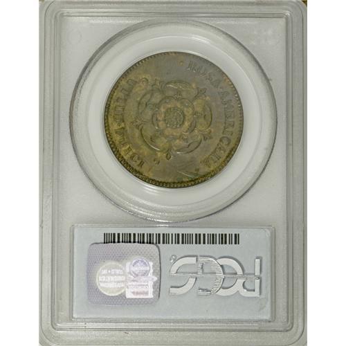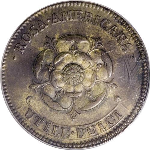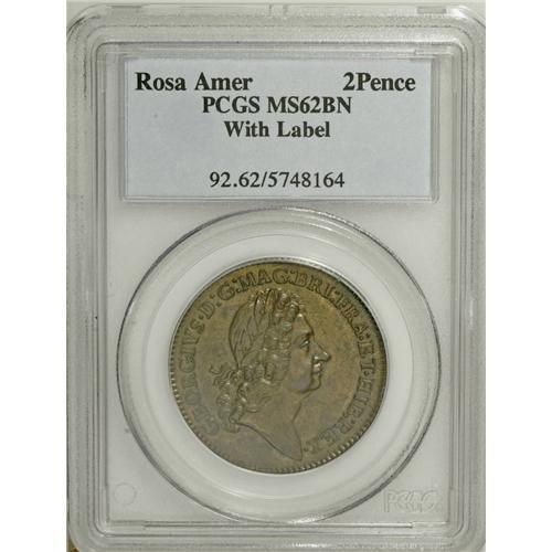 <B>Undated 2PENCE Rosa Americana Twopence, Label MS62 Brown PCGS.</B></I> Breen-88. A beautiful and boldly impressed twopence that features mildly prooflike tan-brown and mahogany fields. Since marks are virtually absent, the grade is only limited by an infrequent whisper of verdigris. Struck from widely rotated dies. Listed on page 40 of the 2007 <I>Guide Book.</B></I> Population: 3 in 62, 2 finer (9/06).<BR><I>From The Jones Beach Collection.</B></I><BR><BR><b>Shipping:</b> Coin/Currency (<a target="_blank" href="http://www.heritageauctions.com/common/shipping.php">view shipping information</a>)