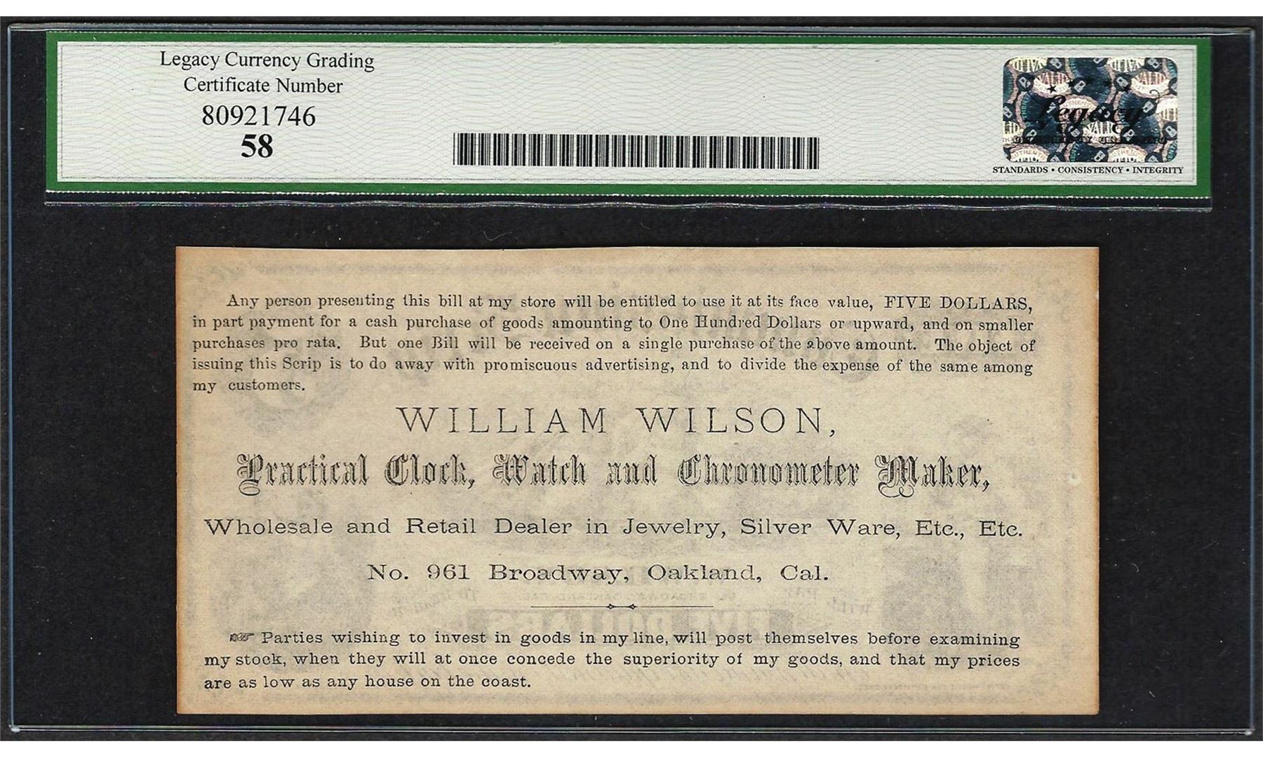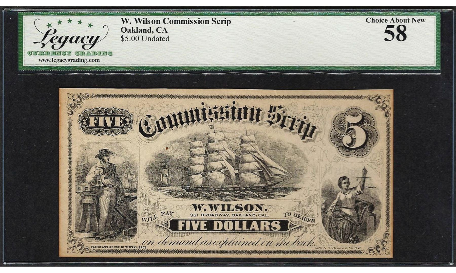 One Undated $5 W. Wilson Commission Scrip Oakland, CA Note Legacy Choice About New 58. Legacy Graded.