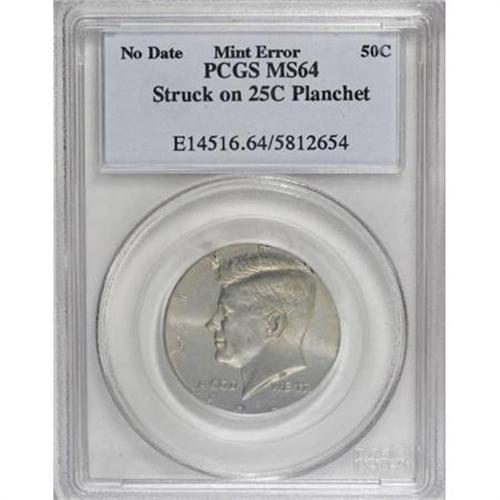 <B>Undated 50C Clad Kennedy Half Dollar--Struck on Quarter Planchet--MS64 PCGS.</B></I> Kennedy's head and the eagle are both sharply struck and fully present. Approximately half of the peripheral elements are in place. Some milky tan patina appears on the reverse, interspersed with golden highlights. The piece is well preserved and highly lustrous<BR><BR><B>Coin Engraver:</B> Gilroy Roberts and Frank Gasparro<BR><BR><b>Shipping:</b> Coins & Currency (<a target="_blank" href="http://www.heritageauctions.com/common/shipping.php">view shipping information</a>)