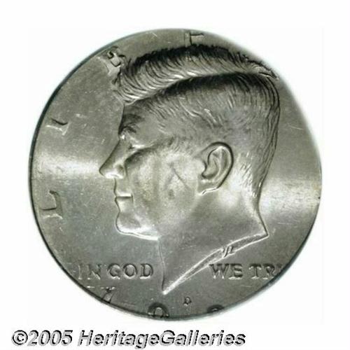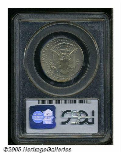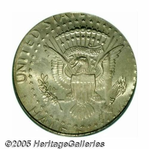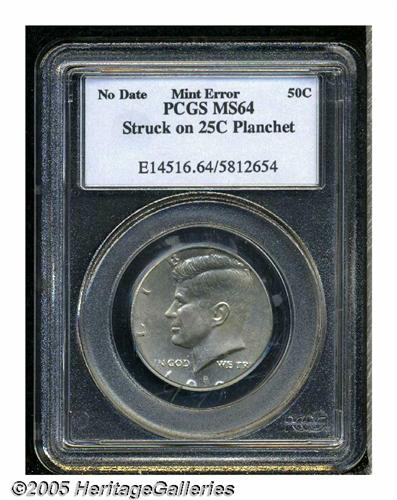 <B>Undated<50C Error> Clad Kennedy Half Dollar--Struck on 25 Cent Planchet--MS64 PCGS.</B></I> Kennedy's head and the eagle design are both sharply struck and fully present. Approximately half of the peripheral elements are in place (see photo image.) Some milky tan patina partially adorns the reverse, and is interspersed with golden highlights. The piece seems well preserved, very lustrous, and essentially unabraded.