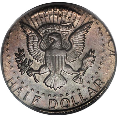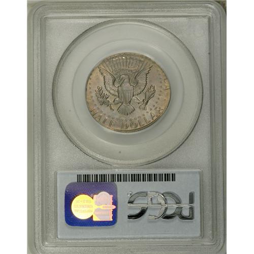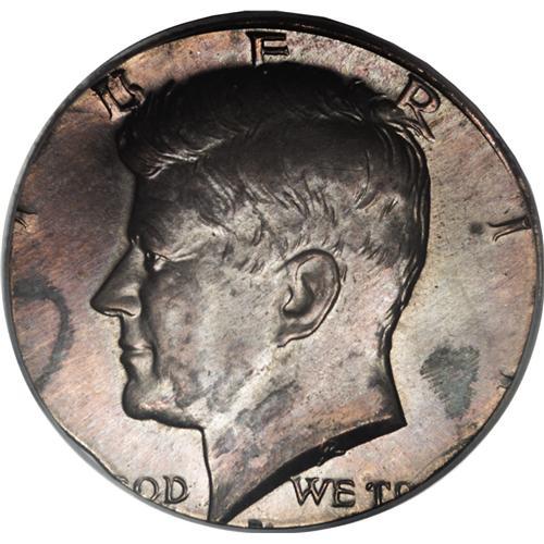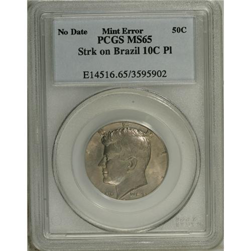 <B>Undated 50C Kennedy Half--Struck on Brazil 10C--MS65 PCGS.</B></I> PCGS implies this Kennedy half was struck on a Brazil 1967 or 1970 10 centavos planchet, KM-578.1 or KM-578.2. The U.S. Mint has never struck coins for Brazil, although a private planchet supplier to the U.S. Mint could also have supplied planchets to Brazil. This partial collar piece is uncentered toward 7:30. The date is absent, and only a sliver of the mintmark is present, but the piece may be a 1969-D, because the prior lot (a 1969-D) was also struck on a Brazil planchet. Lustrous and well preserved with golden-brown and mauve toning.<BR><BR><b>Shipping:</b> Coin/Currency (<a target="_blank" href="http://www.heritageauctions.com/common/shipping.php">view shipping information</a>)