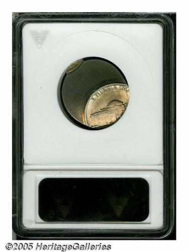 <B>Undated<5C> Jefferson Nickel--Flipover Double Struck--MS63 ANACS.</B></I> The first strike is approximately 40% off center toward 1:30. The date and any mintmark are off the flan, however, the FS initials beneath the bust indicate a 1966 or later date. The piece then flipped over, and was struck 90% off center toward 2:30. The second strike is uniface, only D WE from the motto is present.