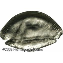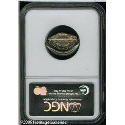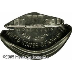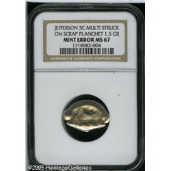 <B>Undated 5C Jefferson Nickel--Multiple Strike on Scrap--MS67 NGC.</B></I> This is a remarkable error that was struck on a piece of planchet scrap that is folded over along the lower edge of the reverse. It resembles an elliptical planchet in shape but is clearly different. The obverse details are broad and weakened, while the reverse details are sharp and complete. Fully lustrous light nickel-gray surfaces with reflective fields on the reverse. Lot:10953