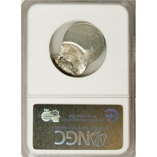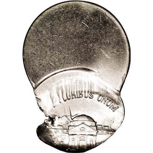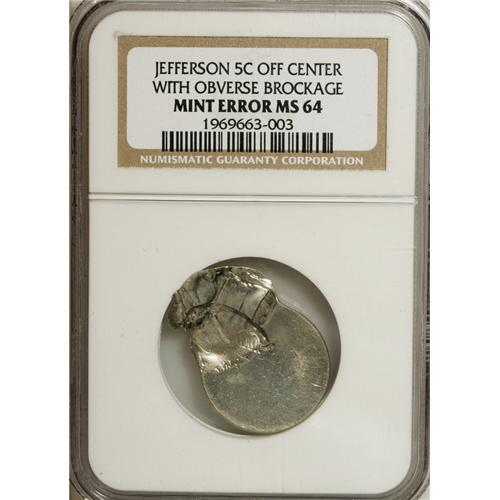 <B>Undated 5C Jefferson Nickel--Off Center with Obverse Brockage--MS64 NGC.</B></I> A struck nickel (not the present coin) failed to be ejected from the coinage chamber. A new planchet (to be the present coin) was fed in, and both pieces were struck approximately 50% off center toward 12 o'clock. The previously struck nickel partially blocked the obverse die, causing a brockage of the lower reverse on the lower left obverse of the present piece. The force of partial brockage causes a flan crack near the brockage boundary.<BR><BR><b>Shipping:</b> Coins & Currency (<a target="_blank" href="http://www.heritageauctions.com/common/shipping.php">view shipping information</a>)