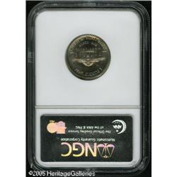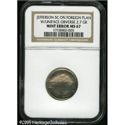 <B>Undated 5C Jefferson Nickel--Struck on Foreign Planchet with Uniface Obverse--MS67 NGC.</B></I> 2.7 grams. This unusual piece (presumably of copper-nickel alloy) features a broadstruck reverse. The obverse die was obstructed by another planchet (not included), which indents the obverse side of this piece. Lustrous and lightly toned in golden hues. Lot:10955