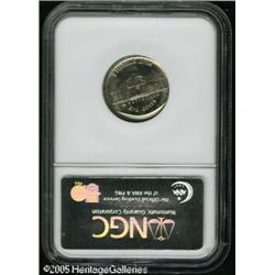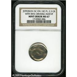 <B>Undated 5C Jefferson Nickel--Struck on a Dime Planchet with 85% Obverse Indent--MS67 NGC.</B></I> 2.3 grams per the NGC label. While the reverse appears to be an undersized version of the regular nickel, virtually the entire obverse consists of a blank indent area with a plain raised lip above. Fully brilliant nickel gray luster. Lot:10952