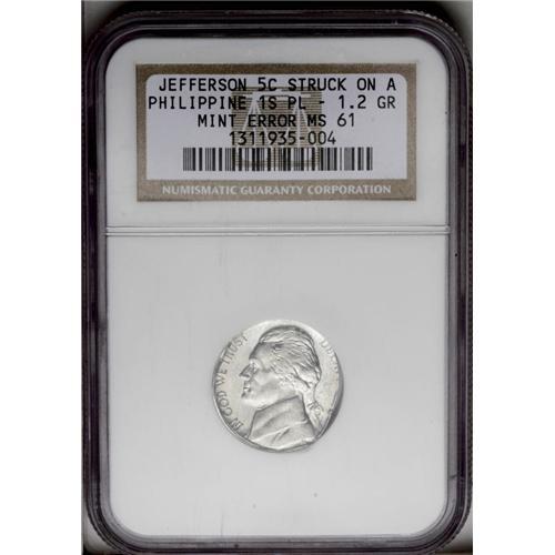 <B>Undated<5C> (circa 1975-6) Jefferson Nickel--Struck on a Philippine 1 Sentimo Planchet--MS61 NGC.</B></I> 1.2 grams. The U.S. Mint struck aluminum rectangular Philippine 1 sentimo pieces in 1975 and 1976. The date of this Jefferson nickel is not present, since the undersized sentimo planchet could not completely fill the dies. Most other design elements are present on this moderately abraded and nearly untoned piece. The left side rim features a knife edge that is partly bent back toward the fields. An Uncertified AU58 1976 Philippine 1 sentimo piece (KM-205) is included, to represent the intended type. <BR><BR><B>Important notice:</B> Heritage usually auctions material at the rate of 200-250 lots per hour. On some occasions eBay Live bid software or the Internet may not be able to keep up with the pace of the auction. We recommend placing a realistic absentee bid now as insurance to avoid disappointment. Occasionally the auctioneer may eliminate or reject an eBay Live bid, and the auctioneer may also reopen a lot after the close of the eBay live bidding (usually because we missed an audience bid), and may reject your bid even if it shows you as the winning bidder. By bidding via eBay Live, you agree that Heritage may award the lot to another bidder at its sole discretion under the circumstances described above or any other reasonable circumstances. Since eBay bids are not shown to us until we open the lot on the floor, we treat those bids just like floor bids. In most cases the floor responds before the eBay bid is presented to us, due to Internet lag time, so for consistency we have made it a policy that floor bids are always considered first over tie eBay live bids. Also please note that all Heritage lots purchased through eBay Live carry a 20% Buyer's Premium. Please make sure you read the Terms and Conditions before you bid. This lot is being auctioned in conjunction with a live floor auction by Heritage Galleries & Auctioneers. All final auction and invoice information will be supplied by Heritage Galleries & Auctioneers, and all other information should be considered preliminary. Lot:5304 <BR><BR><B>Winning Notification and Billing:</B> After the FINAL session in this auction is complete, Heritage will send e-mail and snail mail invoices. This process normally takes several days. All final auction and invoice information will be supplied by Heritage Galleries & Auctioneers, and all other information should be considered preliminary. <BR><BR>This auction will be conducted on a live auction floor and over the Internet through eBay Live. If you choose to place an absentee bid, please take a moment to <font color='#0000ff'><u><a href='http://pages.ebay.com/liveauctions/help/before/laabsentee.html'>learn how eBay Live absentee bidding works</a></u></font><font color='#000000'>