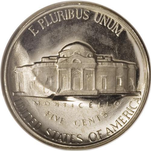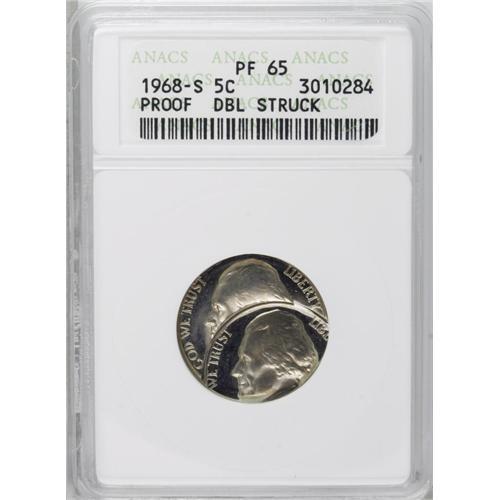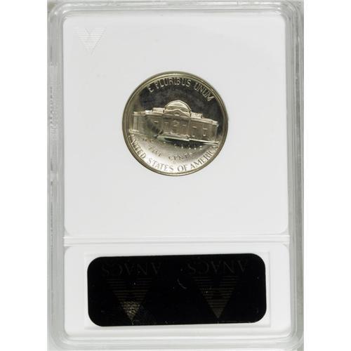 <B>Undated<5C> Proof Jefferson Nickel--Double Struck--PR65 ANACS.</B></I> The ANACS insert states that this piece is a 1968-S, but since the second strike completely overlaps the date and mintmark, we are not certain of its date or mintmark. It is the Reverse of 1970 subtype. The first strike is normal. The second strike is 45% off center toward 4:30. The second strike buckled the portion of the first strike uneffaced by the second strike. Light gold toning is present, and the clean surfaces appear conservatively graded.