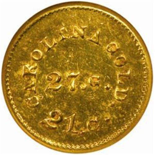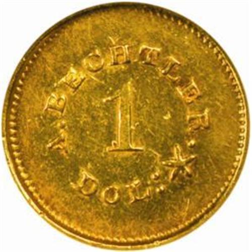 <style type="text/css"> body, td, th { font-family: Arial, Helvetica, sans-serif; font-size: 12px; color: #482424; margin: 0px; padding: 0px; } #header { background-image: url(http://www.bowersandmerena.com/ebay/images/template_v3_01.gif); clear: both; background-color: #590303; border-top-width: 2px; border-top-style: solid; border-top-color: #B38C4F;}#header #header_wrapper { height: 75px; clear: both; width: 800px; margin-right: auto; margin-left: auto; background-image: url(http://www.bowersandmerena.com/ebay/images/template_v3_03.gif); background-repeat: no-repeat; background-position: right; color: #F3EDCC;}#header #header_wrapper #header_logo { float: left; height: 75px; width: 444px; background-image: url(http://www.bowersandmerena.com/ebay/images/template_v3_02.gif); background-repeat: no-repeat; font-size: 10px; text-transform: capitalize; color: #B38C4F;}#header #header_wrapper #header_right { float: left; height: 75px; width: 356px; text-align: right;}#header #header_wrapper #header_right #headerLoginBtn { margin-bottom: 30px;}#header #header_wrapper #header_right input#txtSearch { color: #B49056; border: 1px solid #B49056; width: 175px; padding-top: 3px; padding-right: 3px; padding-bottom: 4px; padding-left: 3px;}#nav { height: 37px; background-image: url(http://www.bowersandmerena.com/ebay/images/template_v3_05.gif); clear: both;}#nav #nav_wrapper { height: 35px; width: 800px; margin-right: auto; margin-left: auto; border-left-width: 1px; border-left-style: solid; border-left-color: #B38C4F;}#nav #nav_wrapper a { padding-right: 15px; padding-left: 15px; border-right-width: 1px; border-right-style: solid; border-right-color: #B38C4F; height: 25px; padding-top: 10px; display: block; float: left; text-decoration: none; font-weight: bold; color: #5D0303;}#nav #nav_wrapper a:hover { color: #B38C4F;}#nav #nav_wrapper #search { float: right; padding-top: 7px;}#nav #nav_wrapper #search #txtSearch { font-family: Arial, Helvetica, sans-serif; font-size: 10px; text-transform: uppercase; color: #D2AE75; border: 1px solid #B38C4F; padding: 3px;}#content_bgd { background-image: url(http://www.bowersandmerena.com/ebay/images/template_v3_09.gif); background-repeat: repeat-y; background-position: center; padding-top: 15px; padding-bottom: 15px; background-color: #FBFBDB;}#content_wrapper { clear: both; height: auto; width: 800px; margin-right: auto; margin-left: auto;}.LotDetailWhite{ line-height:normal; font-size:13px; font-family: arial,helvetica,sans-serif; color: White; font-weight: bold;}.LotDetailInformation{ line-height:normal; font-size: 13px; font-family: arial,helvetica,sans-serif;}.LotDetailMessage{ line-height:normal; font-size: 13px; font-family: arial,helvetica,sans-serif; color: red;}}tr.HeaderAuctionTitle td { color: #000000; font-weight: bold; padding: 2px; background-image: url(http://www.bowersandmerena.com/ebay/images/template_v3_05.gif); background-repeat: repeat-x; border-bottom-width: 1px; border-bottom-style: solid; border-bottom-color: #B38C4F;}table.AuctionSummary a, table.AuctionSummary a:link, table.AuctionSummary a:visited { color: #0000FF; text-decoration: none;}}td.tableHeaderLeft { border-left-width: 1px; border-left-style: solid; border-left-color: #B38C4F;}td.tableHeaderRight { border-right-width: 1px; border-right-style: solid; border-right-color: #B38C4F;}td.tableCellMiddle { border-left-width: 1px; border-left-style: solid; border-left-color: #B38C4F; border-right-width: 1px; border-right-style: solid; border-right-color: #B38C4F; padding: 5px;}tr.footer td { border-top-width: 1px; border-top-style: solid; border-top-color: #B38C4F;}</style></head><body><div id="header"> <div id="header_wrapper"> <div id="header_logo"> </div> <div id="header_right"> </div> </div></div><div id="nav"> <div id="nav_wrapper"> <a href="http://www.bowersandmerena.com">Our eBayLive Auctions</a> <a href="#PaymentInfo">Payment Information</a> <a href="#ShippingInfo">Shipping Information</a> <a href="#About">About Bowers and Merena</a> </div></div><div id="content_bgd"> <div id="content_wrapper"> <table width="100%" border="0" cellpadding="5" cellspacing="0" class="AuctionSummary"> <tbody> <tr class="HeaderAuctionTitle" style="height: 25px;"> <td align="left" class="tableHeaderLeft" > </td> <td align="center" class="tableHeaderRight"> <span style="font-size: large;">Lot #976. Undated (1842-1850) August Bechtler. $1 Gold. K-24. Rarity-3. 27.G., 21.C. Plain Edge. MS-61 (NGC).</span> </td> </tr> <tr> <td colspan="3" class="tableCellMiddle"> This handsome BU example exhibits rich green-gold color with warmer, iridescent-copper highlights that appear to drift toward the borders. All devices are fully struck up from the dies, the fields with an otherwise satiny texture that thins to modest reflective tendencies when the coin dips into a light. Scattered abrasions are mostly small in size, and all are commensurate with the assigned grade.