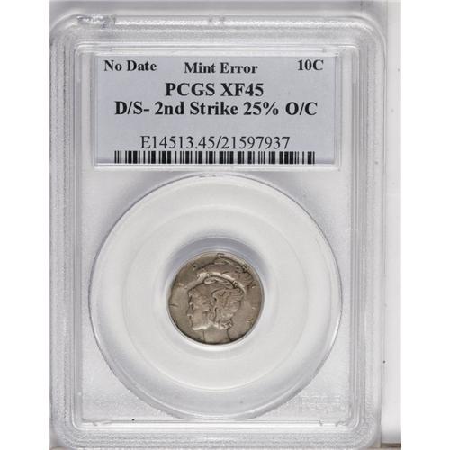 <B>(Undated) Denver Mint<10C> Mercury Dime--Double Struck, Second Strike 25% Off Center--XF45 PCGS.</B></I> The second strike is off-center at 6:30. This is a product of the Denver Mint with a clearly visible mintmark on the reverse. There is no trace of a date, although part of IN GOD WE TRUST is visible on Liberty's cheek. Natural grayish-brown and heather toning.
