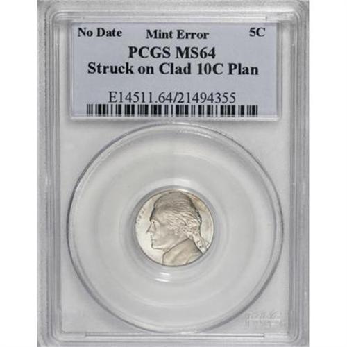 <B>Undated Jefferson Nickel 5C --Struck on a Clad Dime Planchet--MS64 PCGS.</B></I> Elegant gold and blue-green shadings drape the lustrous surfaces of this Choice wrong planchet error. Well struck for the amount of metal available, though the well-centered nature of the error means that no part of the date or mintmark is visible.<BR><BR><B>Coin Engraver:</B> Felix Schlag<BR><BR><b>Shipping:</b> Coins & Currency (<a target="_blank" href="http://www.heritageauctions.com/common/shipping.php">view shipping information</a>)