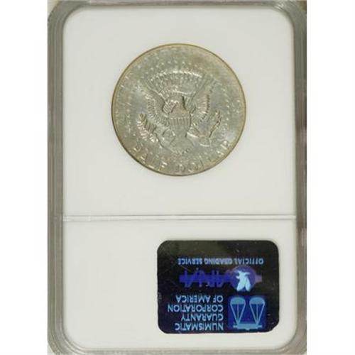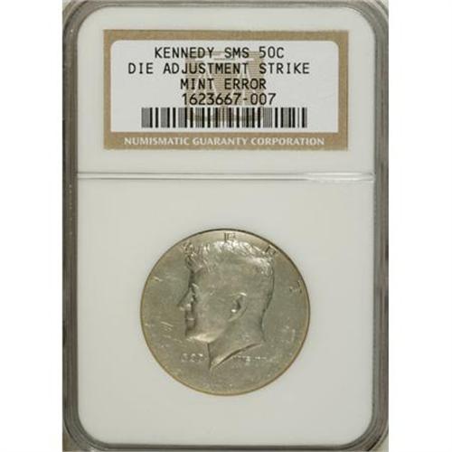 <B>Undated Special Mint Set Kennedy Half--Die Adjustment Strike--NGC.</B></I> Remarkably reflective despite the poor overall definition, which suggests that this piece may have been a die adjustment strike for a proof production run. At the lower reverse, the third digit shows a lower loop that could belong to a 6 or an 8, but the last digit is invisible.<BR><BR><B>Coin Engraver:</B> Gilroy Roberts and Frank Gasparro<BR><BR><b>Shipping:</b> Coins & Currency (<a target="_blank" href="http://www.heritageauctions.com/common/shipping.php">view shipping information</a>)