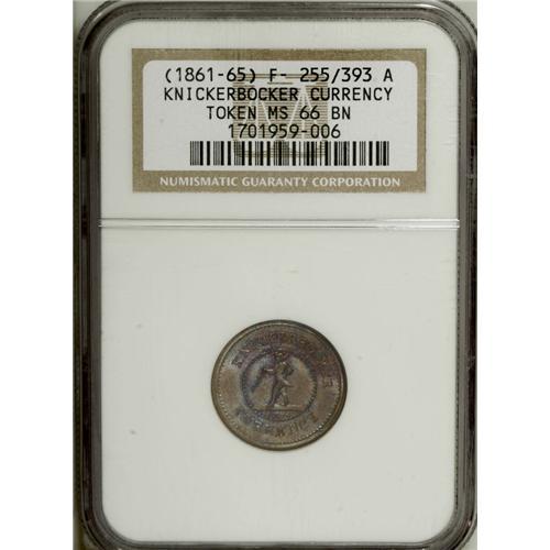 <B>Undated Knickerbocker Currency MS66 Brown NGC.</B></I> Fuld-255/393a. Plum-red and electric-blue overlie lustrous golden-brown surfaces. Evenly struck and refreshingly unabraded. Struck from rusted dies.<BR><BR><b>Shipping:</b> Coin/Currency (<a target="_blank" href="http://www.heritageauctions.com/common/shipping.php">view shipping information</a>)