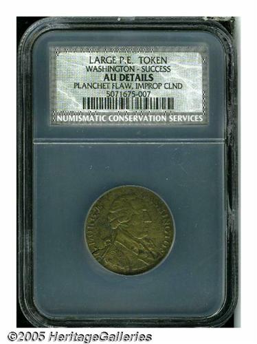 <B>Undated<MEDAL> Washington Success Medal, Large Size, Plain Edge AU Details, Planchet Flaw, Improperly Cleaned, NCS.</B></I> Baker-265. Bright from a mild cleaning, the brassy olive-green surfaces are minutely pitted and cede to lavender toning on the central reverse. A planchet crack from the rim reaches Washington's shoulder. This mint-made flaw is more broad on the reverse. Several pinscratches are noted on the reverse. A scarce issue. Listed on page 68 of the 2005 <I>Guide Book.</B></I>