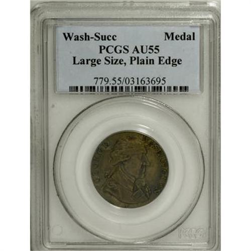 <B>Undated MEDAL Washington Success Medal, Large Size, Plain Edge AU55 PCGS.</B></I> Baker-265. Washington faces to the right, dressed in military garb. The reverse legend, SUCCESS TO THE UNITED STATES, wishes good luck to the newly independent nation. Brown and steel toning accompany the bright olive surfaces of this medal. Traces of the original silvering remain. A heavy obverse crack through Washington's hair allows the top section of the die to seek a slightly lower plane, creating sharper details. Listed on page 80 of the 2008 <I>Guide Book</B></I>.<BR><BR><b>Shipping:</b> Coins & Currency (<a target="_blank" href="http://www.heritageauctions.com/common/shipping.php">view shipping information</a>)