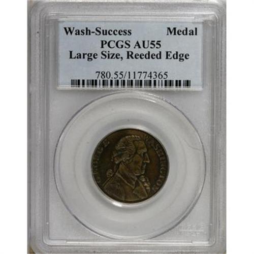 <B>Undated MEDAL Washington Success Medal, Large Size, Reeded Edge AU55 PCGS.</B></I> Baker-266, brass. From a different obverse die than the familiar variety with a die crack from Washington's nose. The eye of providence is incompletely defined, as always throughout the Success Medal series, but the remainder of the design is sharp. The deep olive-brown surfaces are pleasing aside from a few thin marks near TO. Listed on page 80 of the 2007 Guide Book.<BR><BR><b>Shipping:</b> Coins & Currency (<a target="_blank" href="http://www.heritageauctions.com/common/shipping.php">view shipping information</a>)