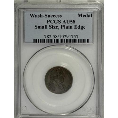 <B>Undated MEDAL Washington Success Medal, Small Size, Plain Edge AU58 PCGS.</B></I> Baker-267A, R.4. This deep brown piece is well centered and has impressive definition, since the all-seeing eye has bold outlines. The early die state with sharp obverse legends. The Small Size Success medals are scarcer than their Large Size counterparts. Listed on page 80 of the 2008 <I>Guide Book.</B></I><BR><BR><b>Shipping:</b> Coins & Currency (<a target="_blank" href="http://www.heritageauctions.com/common/shipping.php">view shipping information</a>)
