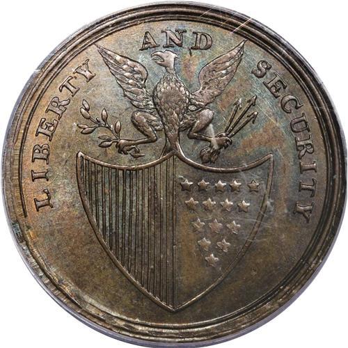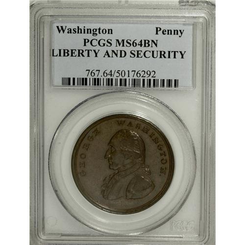 <B>Undated PENNY Washington Liberty & Security Penny MS64 Brown PCGS.</B></I> Baker-30. The "Plain Rims" variety with broad, uneven rims. This moderately prooflike near-Gem shows minor incompleteness on the epaulet and hair, but the overall strike is good. Lovely rose and olive patina contributes to the eye appeal, which is ensured by the smooth, spot-free surfaces. Listed on page 80 of the 2007 <I>Guide Book.</B></I> Population: 13 in 64, 4 finer (3/07).<BR><BR><b>Shipping:</b> Coins & Currency (<a target="_blank" href="http://www.heritageauctions.com/common/shipping.php">view shipping information</a>)