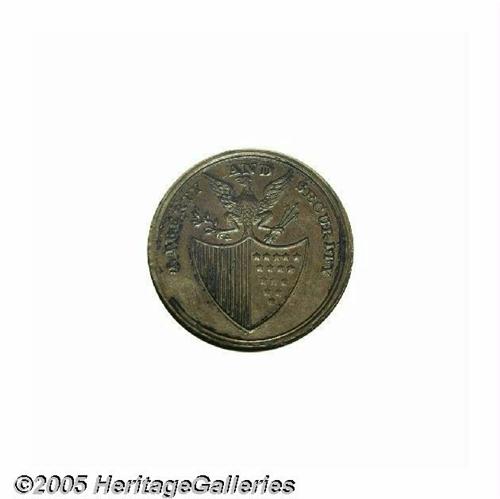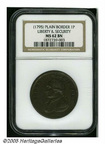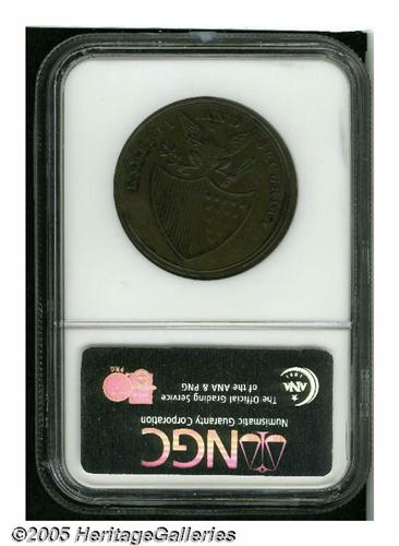 <B>Undated<PENNY> Washington Liberty & Security Penny MS62 Brown NGC.</B></I> Baker-30, R.2. Plain Edge. A boldly struck chocolate-brown and steel-blue representative. The surfaces are quite smooth. A few traces of verdigris accompany peripheral letters. The curious edge ridges and depressions are as made; compare with the <I>Guide Book</B></I> plate coin, which is from the same die pair. Listed on page 68 of the 2005 <I>Guide Book.</B></I>
