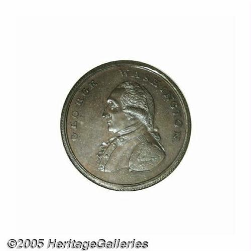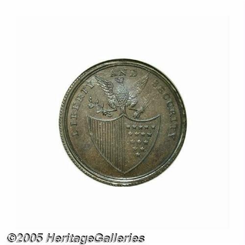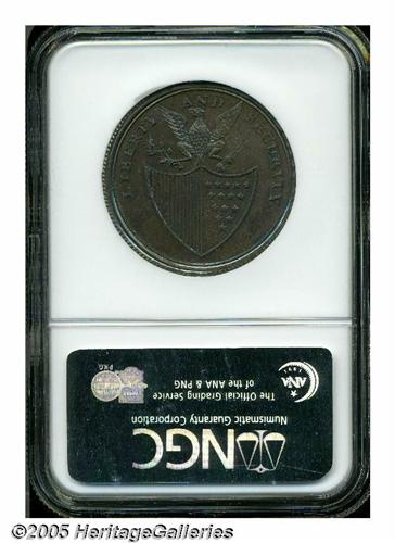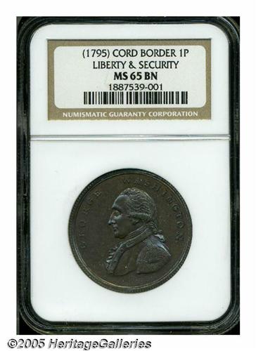 <B>Undated<PENNY> Washington Liberty & Security Penny, Corded Rim MS65 Brown NGC.</B></I> Baker-30E. A rare variant of the Liberty and Security Penny that has engine-turned rims, an improvement over the crude rims on the usually encountered Plain Edge variety. This piece was very well cared for over the generations. The surfaces have a deep brown and blue iridescence that is most attractive, the coloration being highlighted by bright prooflikeness in the fields. Slight softness on the upper right reverse and on Washington's epaulet is of little consequence. As of (6/05), the only example of Baker-30E certified by NGC. Listed on page 68 of the 2005 <I>Guide Book.</B></I>