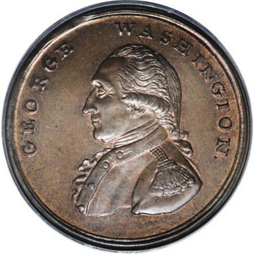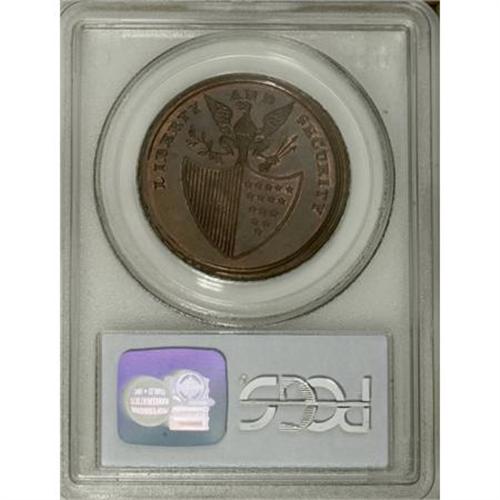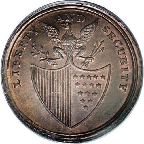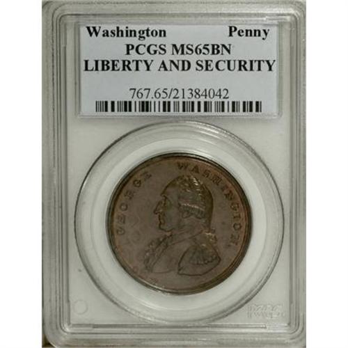 <B>Undated PENNY Washington Liberty & Security Penny MS65 Brown PCGS.</B></I> Baker-30. The "Plain Rims" variety, identified by its broad, lumpy obverse rim. A handsome example of this popular Washington penny. The medium brown fields are moderately reflective, and substantial glimpses of the initial fire-red iridescence fill the legends and shield. Marks are inconsequential, and the eye appeal is formidable. The portrait is based upon the 1791 large and small eagle cents, while the reverse is clearly patterned after the 1795 Liberty and Security token. Listed on page 80 of the 2007 <I>Guide Book.</B></I> Population: 3 in 65 Brown, 1 finer (7/07).<BR><BR><b>Shipping:</b> Coins & Currency (<a target="_blank" href="http://www.heritageauctions.com/common/shipping.php">view shipping information</a>)