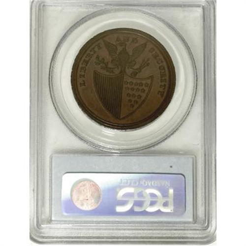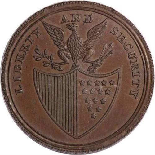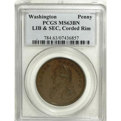 <B>Undated PENNY Washington Liberty And Security Penny, Corded Rim MS63 Brown PCGS.</B></I> Baker-30E. Much scarcer than its Plain Rims counterpart, the Corded Rim is identified by the teeth-like pattern throughout both rims. Rulau (1999) stated, "12 specimens known," up slightly from the 1988 Breen estimate of "8-10 known." This sharply struck Select representative has smooth and prooflike cherry-wood fields. Essentially void of marks, although a thin, diagonal planchet flaw through the D in AND will identify the present specimen in any future auction appearances. Listed on page 80 of the 2008 <I>Guide Book. </B></I>Population: 2 in 63, 1 finer (8/07).<BR><BR><b>Shipping:</b> Coins & Currency (<a target="_blank" href="http://www.heritageauctions.com/common/shipping.php">view shipping information</a>)