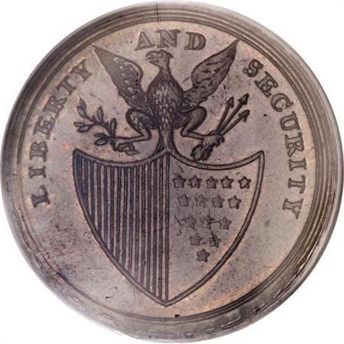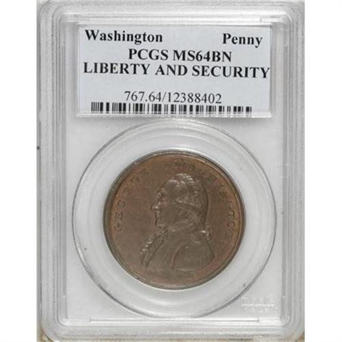 <B>Undated PENNY Washington Liberty & Security Penny MS64 Brown PCGS.</B></I> Baker-30. Mint red emerges from design recesses, although this lovely near-Gem is predominantly medium brown. A good strike with the expecting blending noted on the epaulet and on the right (facing) wing. Well preserved despite a few pinpoint marks on the face. Listed on page 80 of the 2008 <I>Guide Book.</B></I> Population: 15 in 64 Brown, 4 finer (3/08).<BR><BR><b>Shipping:</b> Coins & Currency (<a target="_blank" href="http://www.heritageauctions.com/common/shipping.php">view shipping information</a>)