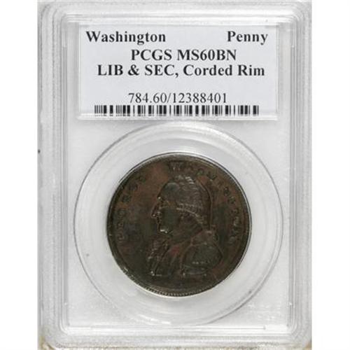<B>Undated PENNY Washington Liberty & Security Penny, Corded Rim MS60 Brown PCGS.</B></I> Baker-30E. The scarcer Corded Rims variety, which exhibits tooth-like dentils on the rim. Mahogany-brown in color with frequent glimpses of lighter golden-brown toning. A good strike, particularly on the eagle's breast, although the epaulet is not fully defined. Listed on page 80 of the 2008 <I>Guide Book.</B></I><BR><BR><b>Shipping:</b> Coins & Currency (<a target="_blank" href="http://www.heritageauctions.com/common/shipping.php">view shipping information</a>)