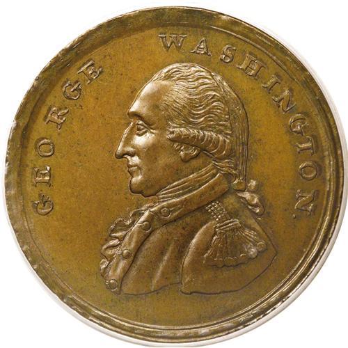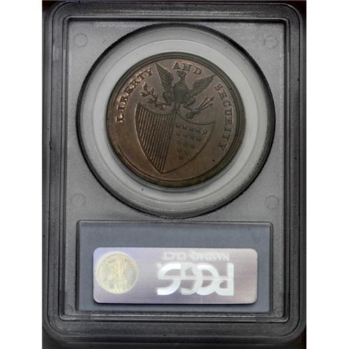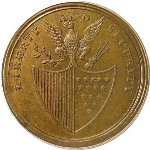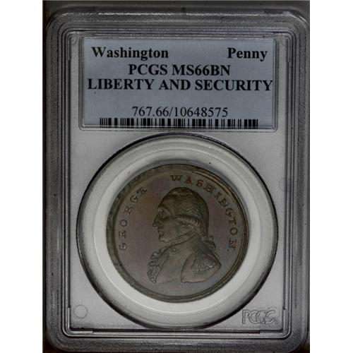 <B>Undated<PENNY> Washington Liberty and Security Penny MS66 Brown PCGS.</B></I> Plain rims. Baker-30, R.2. This beautiful Premium Gem has lovely steel-blue and lilac tints on the obverse, while the reverse has rose-gold and olive accents. Glimpses of the original brick-red are apparent within the reverse legends. No abrasions or spots can be reported. The strike is bold save for the lowest stars within the shield. The present piece is the single finest certified by PCGS. In addition, excluding restrikes, the total number of colonials graded 66 or better is only 34 coins out of over 12,000 coins graded. Listed on page 80 of the 2007 <I>Guide Book.</B></I>