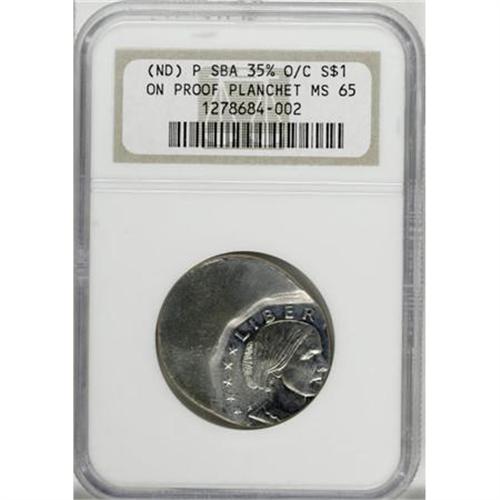 <B>Undated Philadelphia Susan B. Anthony Dollar--Struck 35% Off-Center on a Proof Planchet--MS65 NGC.</B></I> Faint golden tints visit the gleaming surfaces of this gorgeous SBA error, which shows the design 35% off-center toward 4 o'clock on the obverse. Crisply struck with the 11-sided inner rim providing a fascinating effect. Error pieces from this short-lived series are exceedingly rare in the marketplace, and the piece offered here is particularly desirable.<BR><BR><b>Shipping:</b> Coins & Currency (<a target="_blank" href="http://www.heritageauctions.com/common/shipping.php">view shipping information</a>)
