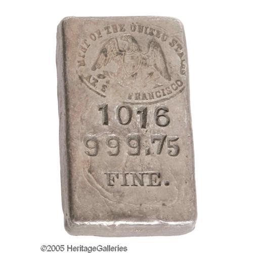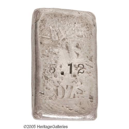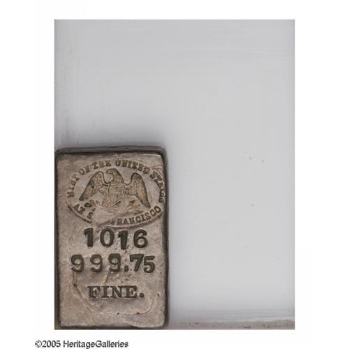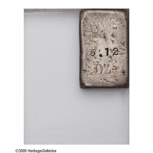 <B>Undated San Francisco Mint Silver Ingot.</B></I> 5.12 ounces. While the most frequently encountered of all the Mint/Assay Office issues, this is the only silver ingot in this sale from San Francisco. The most comprehensive collection that we are aware of (60 pieces) was offered in our September 2005 Long Beach Auction. The top side has the old-style oval imprint / 1016 / 999.75 / FINE. The back reads: 5.12 /OZs, and OZs is double-stamped. Moderate gray-rose patina with a few marks on the back side.