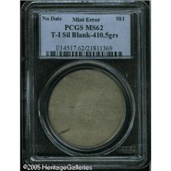 <B>Undated<img border='0' src='http://www.heritagecoins.com/images/star.gif' width=10 height=10>$1 Type One Silver Blank MS62 PCGS.</B></I> 410.5 grains. The weight (26.6 grams) approaches the statutory weight (26.73) for the 90% Silver Dollar. The rims are not raised on this piece, which indicates that it never passed through the upset mill. Undoubtedly scarce. Light gold color visits the not unduly marked surfaces. Lot:11028