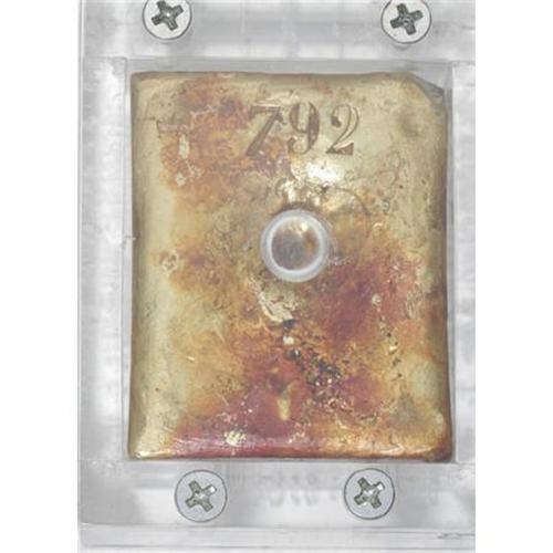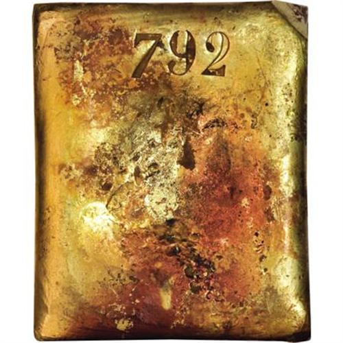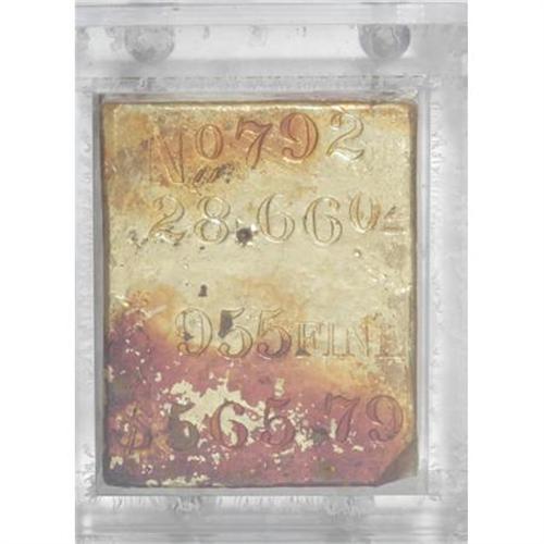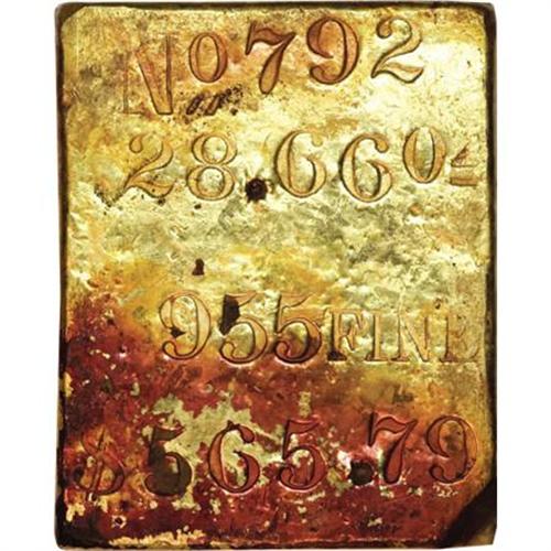 <B>Unmarked Kellogg & Humbert Gold Ingot MS Uncertified.</B></I> The most unusual aspect of this ingot is the lack of an assayer's imprint. We have never seen another ingot lacking the imprint and are unaware if any others were included in the salvage of the <I>S.S. Central America</B></I>. After turning the ingot several times and examining each of the six sides, our instinct was to say it was a Kellogg product. Apparently that is the same conclusion Christie's came to when they inventoried the <I>Central America </B></I>ingots and sold many of them in 2000. In the appendix in their auction from December of that year, they list ingot number 792 under the Kellogg & Humbert pieces, without comment. <BR> A small to moderate-sized ingot by the standards of those recovered from the <I>S.S. Central America</B></I>, it measures 42 x 53 x 20 mm. The top side reads: No 792 / 28.66 Oz / 955 FINE / $565.79. The dollar amount representing the value of the ingot expressed in 1857 dollars. The ingot number, 792, is reproduced at the top of the back side. Two assay chips are taken out of opposing corners. Deeply stained throughout from decades of exposure to the rusting iron from the ship's hull. An interesting and attractively colored Territorial ingot. <BR><BR><b>Shipping:</b> Coins & Currency (<a target="_blank" href="http://www.heritageauctions.com/common/shipping.php">view shipping information</a>)