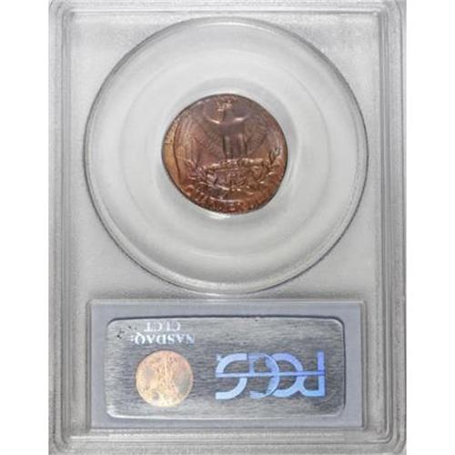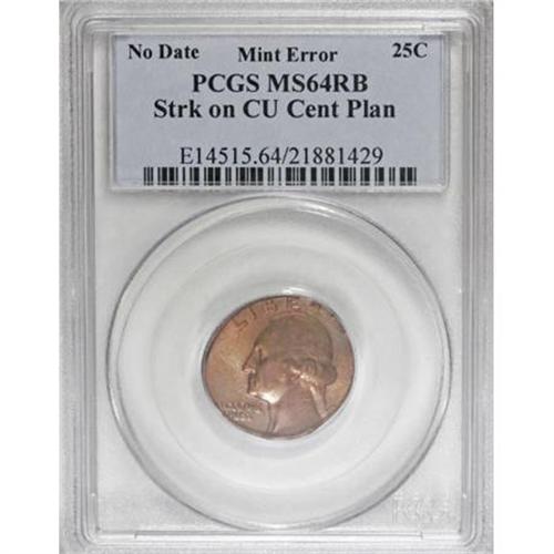 <B>Undated Washington Quarter 25C --Struck on a Copper-Base Cent Planchet--MS64 PCGS.</B></I> Softly struck with vivid orange, rose, and violet shadings. The planchet is either bronze or brass, though the patina makes this impossible to determine without sophisticated analysis. An attractive off-metal quarter.<BR><BR><B>Coin Engraver:</B> John Flanagan<BR><BR><b>Shipping:</b> Coins & Currency (<a target="_blank" href="http://www.heritageauctions.com/common/shipping.php">view shipping information</a>)