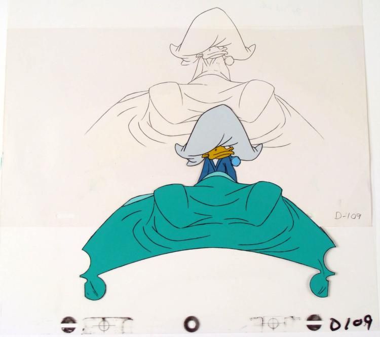 Under covers * * * * * Original Animation Cel & DrawingMedium: Hand painted acetate celDetails: Animation notations and peg holes * * Original "rough" animation drawing, in non-photo blue and black pencil * * Size of cel: 10 1/2 x 12 1/2 inchesSize of drawing: 10 1/2 x 12 1/2 inches * * Condition: Very good * This is an original hand-painted cel set-up used in the production of the "Walt Disney Shows." Each one-of-a-kind set-up represents a slight change in position of the characters. When individually photographed and projected in rapid succession, the images appear * to move. To created production cels, the original animator's drawing is transferred onto an acetate cel (by hand-inking and/or photo copying). The cel is then hand-painted on the reverse side. * * * * * Traditional animation is a multi-step process which includes various types of art techniques. Drawings are a key part of the process, in which the animator creates the design and movement of the characters. Drawings are then transferred onto acetate cels * (by hand-inking and/or photo copying) to create a production cel, which is then hand painted on the back side, using paint colors chosen and approved by the creator of the series.