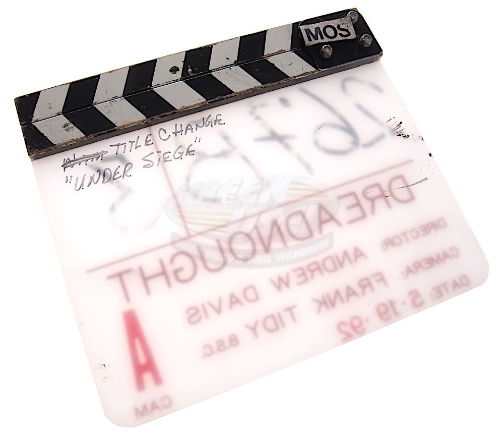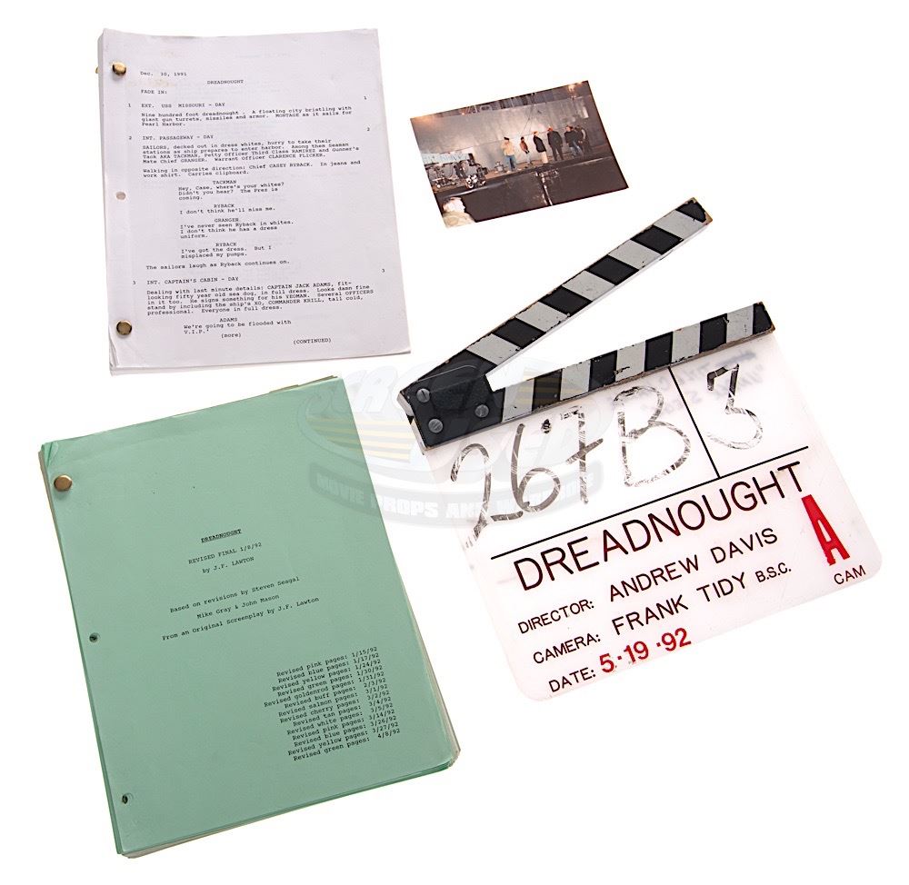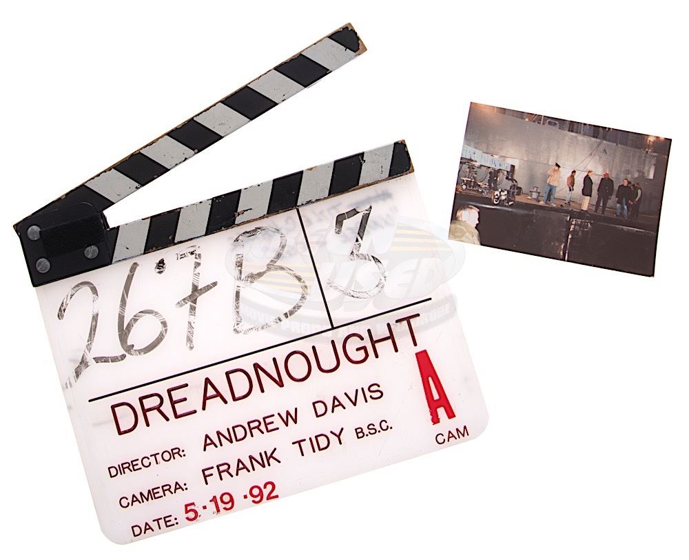 (Warner Bros., 1992) This clapper board and scripts were used during filming and feature wear consistent with use. Both the clapper board and scripts feature the film's original title "Dreadnought". The clapper board has the final shot markings with the filming date hand applied with numbered stickers. One script is dated Dec 30, 1991 and the second script is dated April 7, 1992. Included with the clapper board and scripts is a 4" x 6" color photograph taken on set during filming.