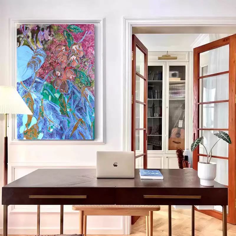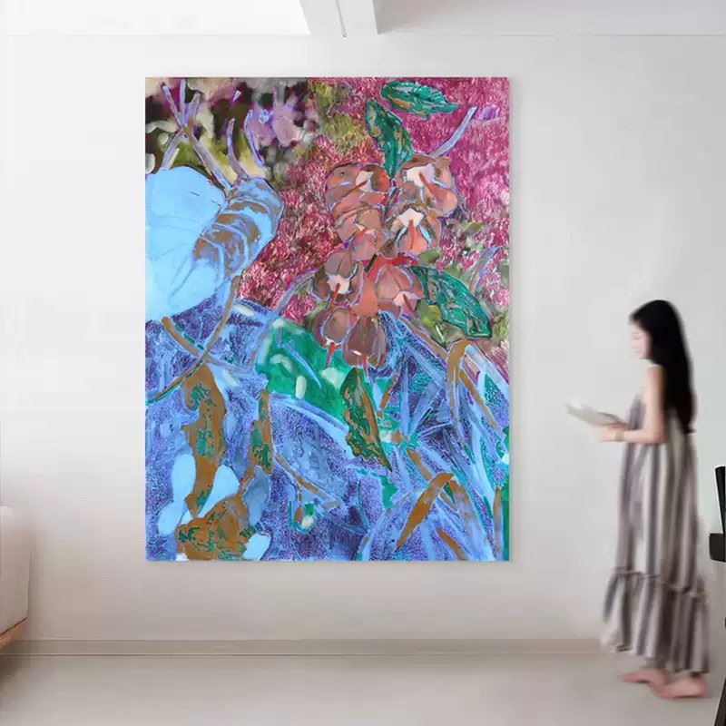 The painting is dominated by a contrast of rose pink and bluish violet, with a cluster of warm orange-brown flowers emerging from slanting leaves, like a secret hidden under a rose. Interwoven cool and warm hues create a slight sense of visual haze, giving the scene an ambiguous, dreamlike mood. Dimensions: 24 x 31 inches.