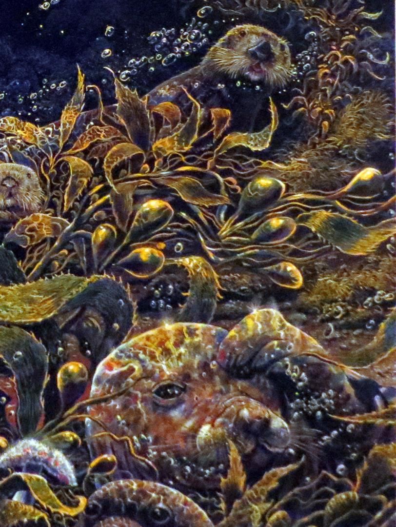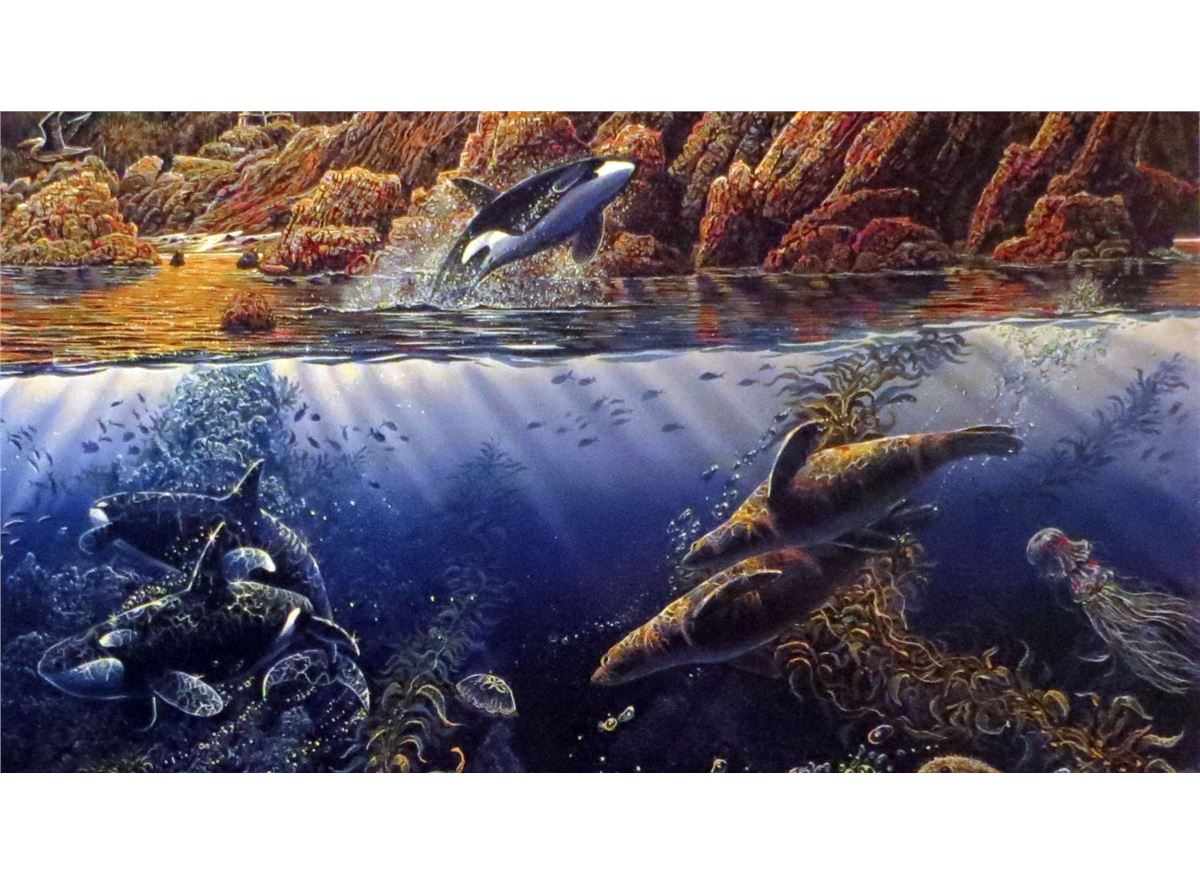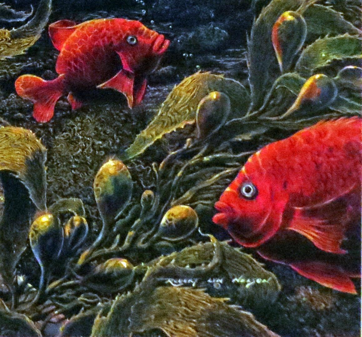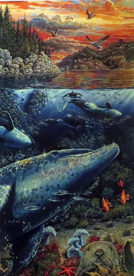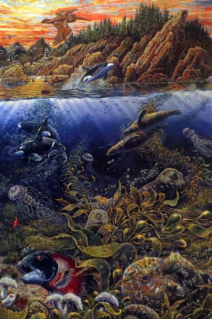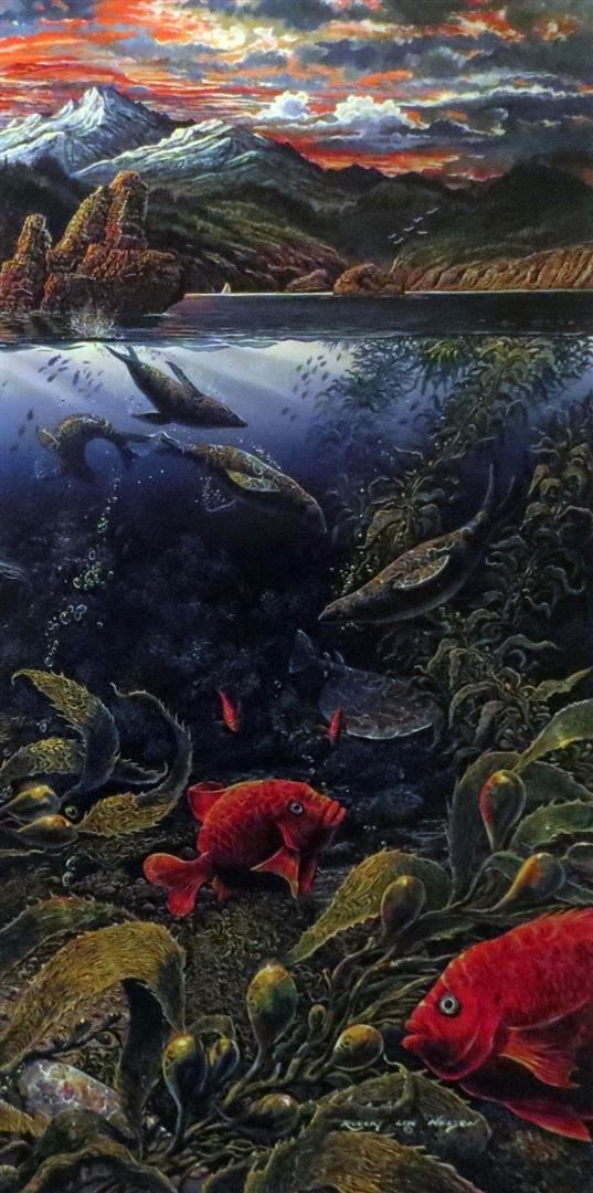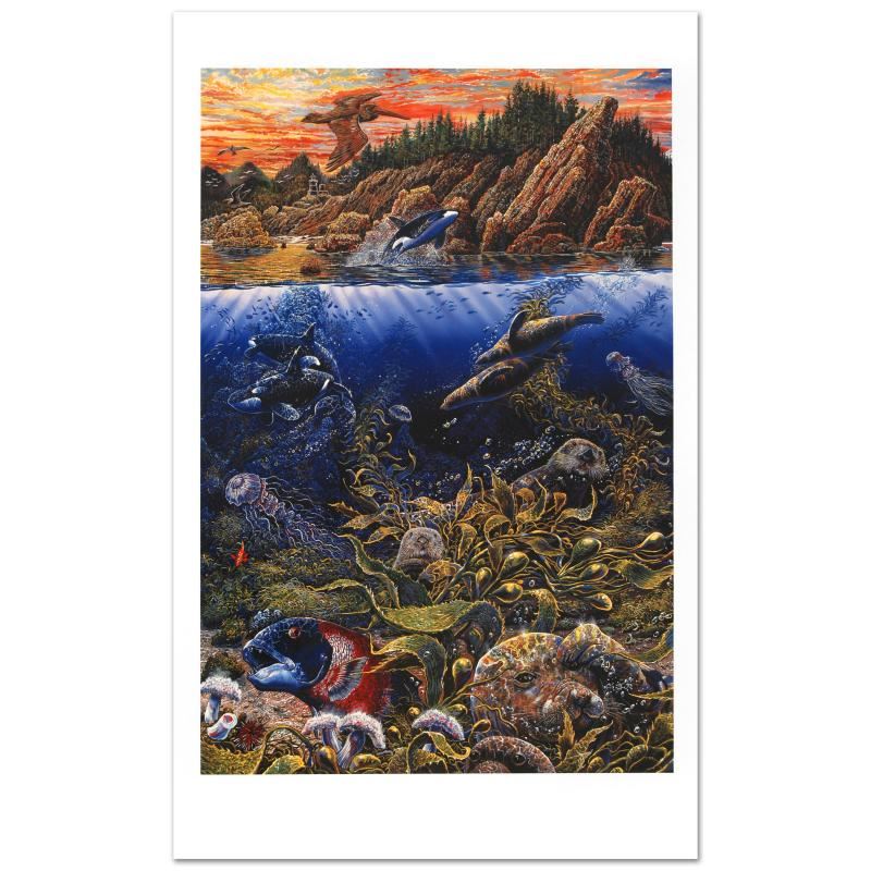 Underwater World is a limited edition mixed media on paper by Robert Lyn Nelson, numbered and hand signed by the artist! This artwork consists of three separate pieces that are meant to be displayed together as a triptych. Includes Certificate of Authenticity! Measures Approx: 48" x 29" (all three pieces combined), 16" x 24" (center image), 12" x 24" inches (left and right images).