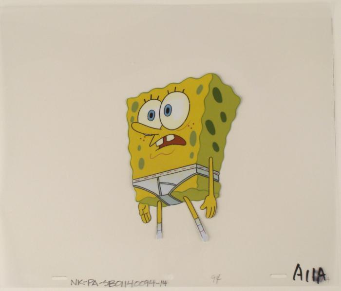 This original animation cel is from the Nickelodeon TV show SpongeBob Squarepants. The story takes place under the deep blue sea in Bikini Bottom, where SpongeBob resides. SpongeBob, who is a yellow, porous sponge, is your typical happy-go-lucky character, as he is always cheerful and enjoys making people laugh. Patrick Star, SpongeBob's neighbor who is a starfish, is your average children's show idiot, as he boasts knowing nothing and is often getting himself into ridiculous situations. Between the homes of these two lies the home of the miserable Squidward, a squid, who is known for being grouchy and playing tricks on SpongeBob and Patrick. Both SpongeBob and Squidward work at the Krusty Krab, a fast food business run by the greedy money-loving Mr. Krabs, a crab, the arch rival of the evil, possibly misunderstood, Plankton. Another neighbor, Sandy Cheeks, an athletic squirrel who normally wears an astronaut's space suit, was introduced in "Tea at the Treedome." She spends most of her time inventing and experimenting. Why is SpongeBob in his underwear?Original Production Animated Cel Overall Size of Cel: 10 1/2" x 12 1/2" Very Good ConditionThis is an original hand-painted cel set-up used in the production of an episode of "SpongeBob SquarePants." Each one-of-a-kind set-up represents a slight change in position of the characters. When individually photographed and projected in rapid succession, the images appear to move.