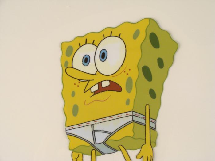 This original animation cel is from the Nickelodeon TV show SpongeBob Squarepants. The story takes place under the deep blue sea in Bikini Bottom, where SpongeBob resides. SpongeBob, who is a yellow, porous sponge, is your typical happy-go-lucky character, as he is always cheerful and enjoys making people laugh. Patrick Star, SpongeBob's neighbor who is a starfish, is your average children's show idiot, as he boasts knowing nothing and is often getting himself into ridiculous situations. Between the homes of these two lies the home of the miserable Squidward, a squid, who is known for being grouchy and playing tricks on SpongeBob and Patrick. Both SpongeBob and Squidward work at the Krusty Krab, a fast food business run by the greedy money-loving Mr. Krabs, a crab, the arch rival of the evil, possibly misunderstood, Plankton. Another neighbor, Sandy Cheeks, an athletic squirrel who normally wears an astronaut's space suit, was introduced in "Tea at the Treedome." She spends most of her time inventing and experimenting. Why is SpongeBob in his underwear?Original Production Animated Cel Overall Size of Cel: 10 1/2" x 12 1/2" Very Good ConditionThis is an original hand-painted cel set-up used in the production of an episode of "SpongeBob SquarePants." Each one-of-a-kind set-up represents a slight change in position of the characters. When individually photographed and projected in rapid succession, the images appear to move.
