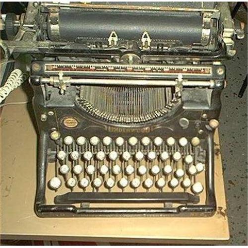 Antique Underwood Typewriter. bottom front reads, Underwood Standard typewriter., No. 5 There is a label from a repair company which reads, Southern Typewriter Exchange, 25 1/2 Commerce St. Montgomery. Supplies Typewriters Repairs. Made in USA. Weighs aprx. 50 pounds. This typewriter still types, a key will stick on occasion.