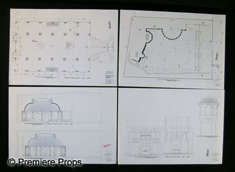 Used to design sets for 'Underworld: Rise of the Lycans' (2009) starring Rhona Mitra. Includes four architectural drafts detailing different sets. Designs include a castle crypt elevation layout, castle courtyard elevation layout, castle courtyard studio plan and castle great hall layout plan. The edges of the paper are bent, but otherwise in good condition. (Measures approx. 16.5" x 11.75" ea.)