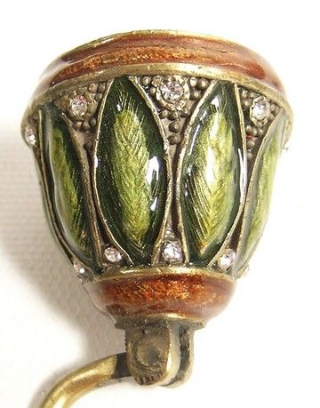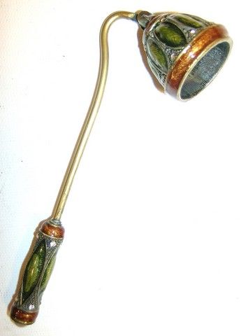 Used in the production of 2009's 'Underworld: Rise of the Lycans' starring Rhona Mitra. This background prop is a beautifully designed ornate candle snuffer. Prop is green and gold colored with an inlaid leaf pattern and faux diamonds. Very detailed. (Measures approx. 7.5" long).