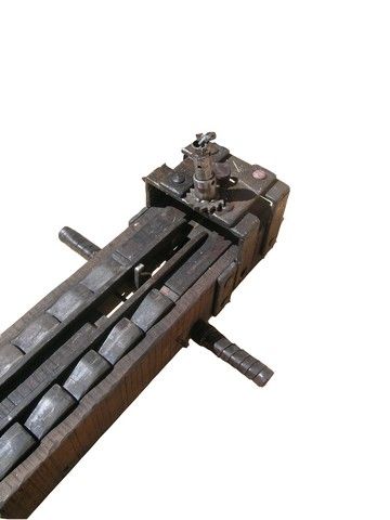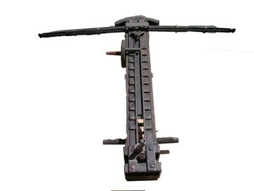 Used in the production of 'Underworld: Rise of the Lycans' (2009), starring Rhona Mitra and Michael Sheen. This large crossbow is a background prop, used in the scene where werewolves are chasing Sonja's character (Mitra) toward the compound, and Lucian (Sheen) leads a Death Dealer attack to save her. Oversized item. Additional postage required. (approx. 70" x 84")