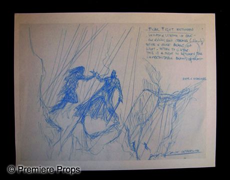 An original hand drawn production sketch of the climax of the film, 'Underworld: Rise of the Lycans' (2009). The artwork depicts Lucian's (Michael Sheen) and Viktor's (Bill Nighy) final fight in the cave, with handwritten details in the upper-right hand corner. The paper is slightly wrinkled. (Measures approx. 8.25" x 11.75")