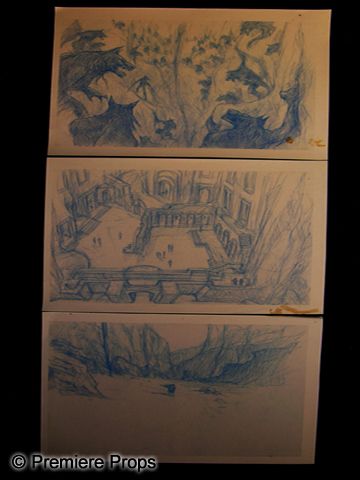 Three original hand drawn production sketches from 'Underworld: Rise of the Lycans' (2009) starring Bill Nighy and Rhona Mitra. These pieces of artwork depict a werewolf attack, a scene in the courtyard, and a man on horseback. The pages are slightly wrinkled and there is some glue from use on set during production on the lower right hand side of the first two drawings listed. (Measures approx. 8.25" x 11.75")