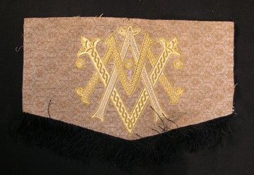 This is Viktor's (Bill Nighy) screen used gold emblem, from the 2009 fantasy-action film, 'Underworld: Rise of the Lycans'. The emblem is embroidered with gold thread on brown cloth with black tassels at the bottom. (Measures approx. 15"x10").