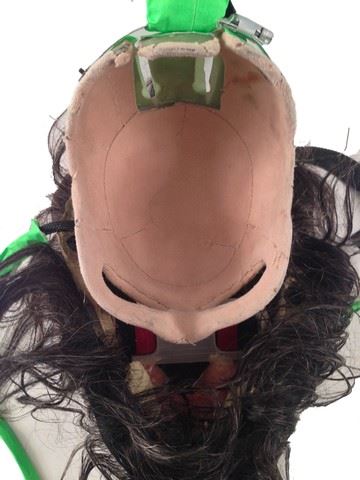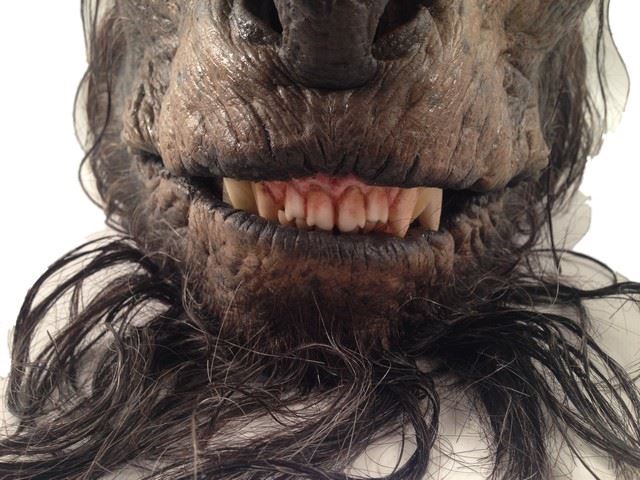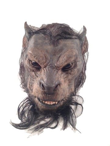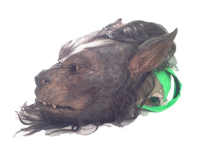 Screen used hero animatronic lycan head mask made with latex with realistic teeth and hair. Comes with attached cord and helmet inside. With green screen tape covering the helmet and cord. Includes remote, battery packs and AC/DC charger (approx. 14"x10" for head mask). Used in Awakening and Blood Wars.