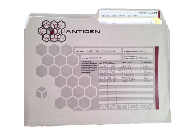 Antigen' Lab file folder with 'Antigen' name, logo, and project information printed on front, in and out times and ID numbers handwritten on front as well, and over 15 pages of paperwork within.(12"x10").